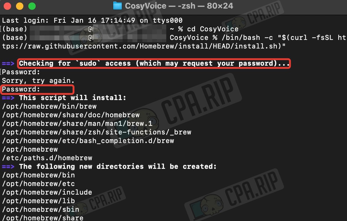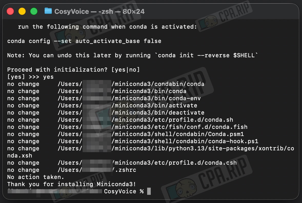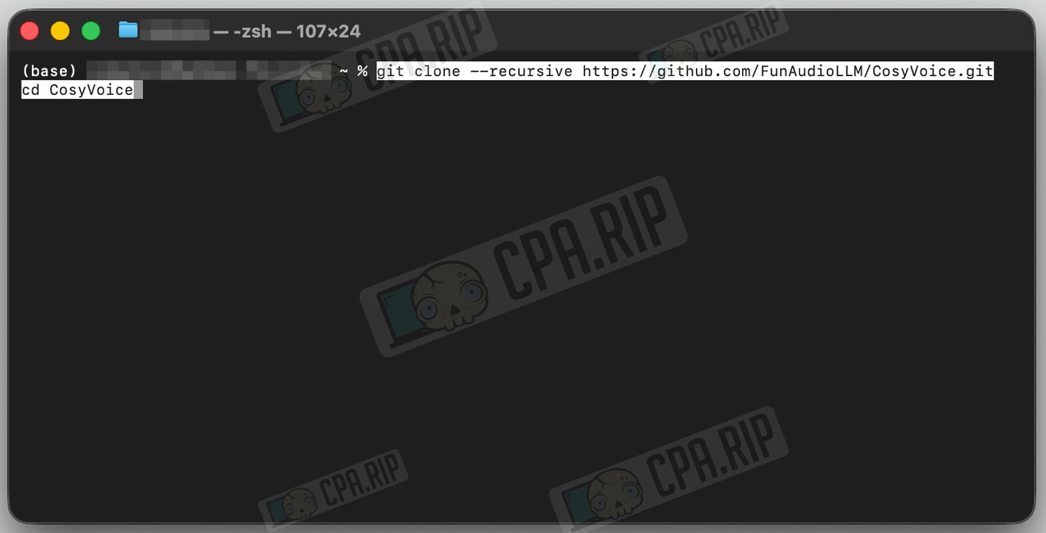 Все необходимые инструкции по установке доступны на официальной странице проекта https://github.com/FunAudioLLM/CosyVoice. Опираясь на нее пошагово и со скринами разберем установку и запуск. Устанавливать будем через терминал на примере macOS. На Windows установка и запуск аналогичны macOS через Miniconda, которую надо ставить первым шагом до клонирования репозитория. Отличия будут в том, что команды выполняются в Anaconda Prompt или PowerShell, а ffmpeg устанавливается через conda.