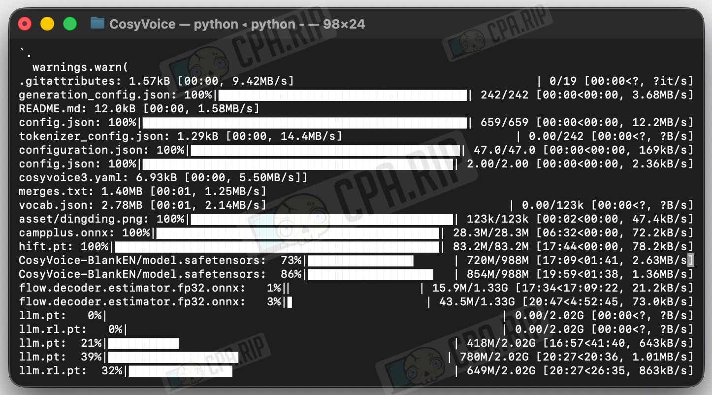 - Далее выполните команду которая запустит python и начнет скачивание CosyVoice3-0.5B через heredoc:
