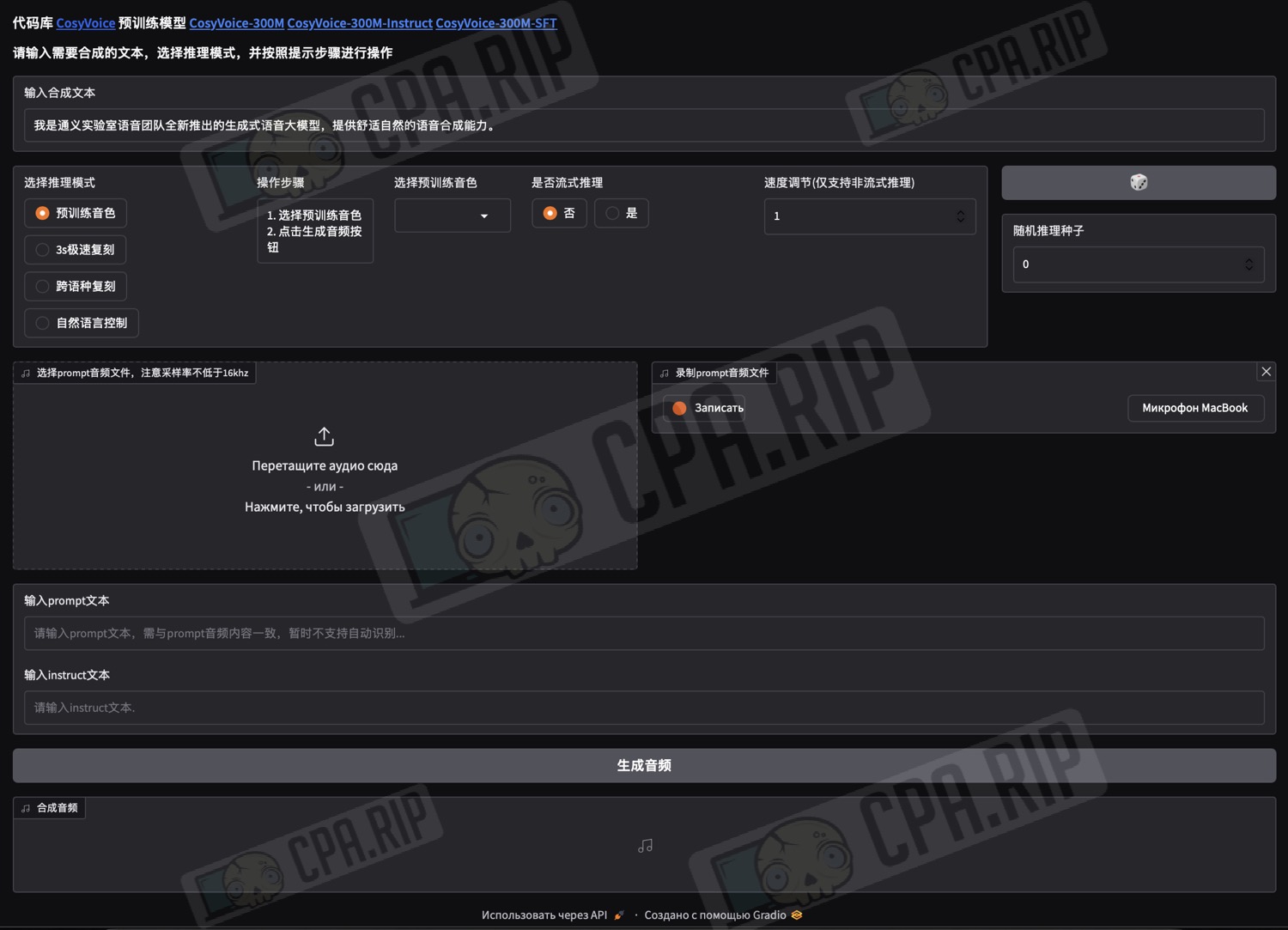 Интерфейс CosyVoice 3 на китайском языке, для удобства работы переводите штатными средствами браузера на нужный вам язык.