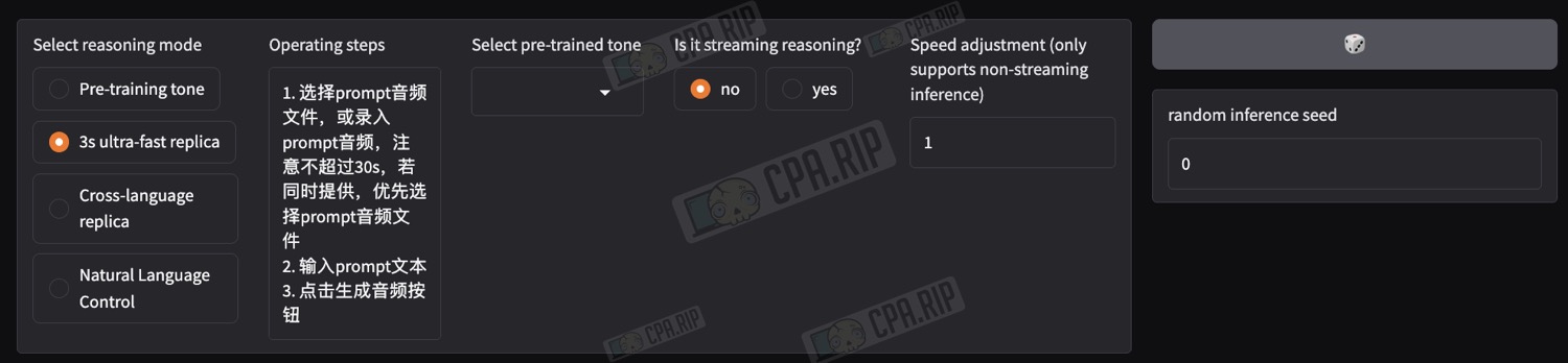 - «3s ultra-fast replica» — режим для стандартного клонирования голоса на основе аудиозаписи и без смены языка