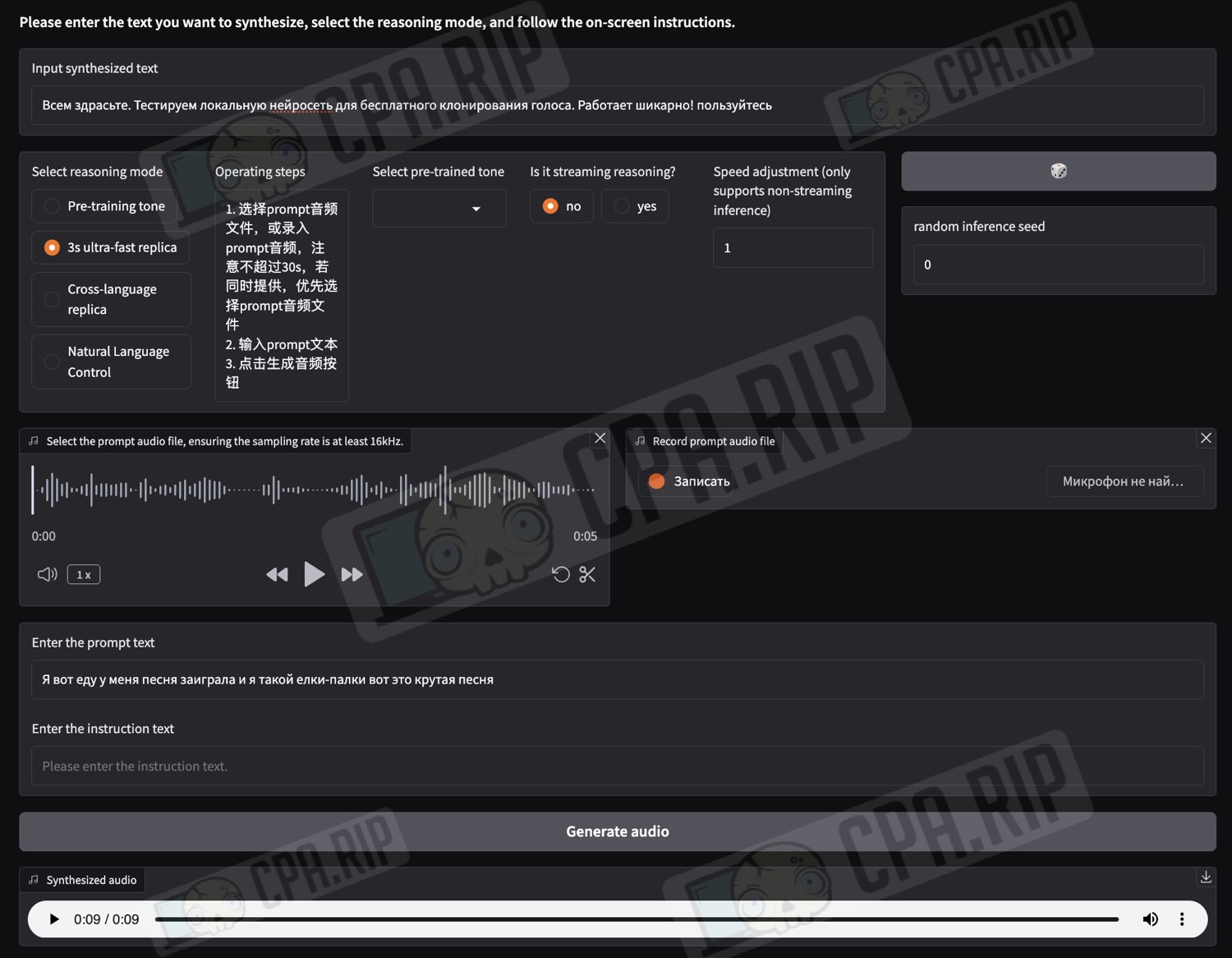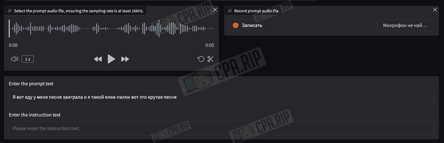Лайфхак: если в режиме кроссъязычного клонирования результат получается невнятным или будет напоминать китайскую речь, попробуйте явно указать язык перед текстом озвучки. Например, добавьте в начале фразу: Please speak in English. В большинстве случаев модель начинает говорить на нужном языке, а лишнюю реплику можно будет обрезать.