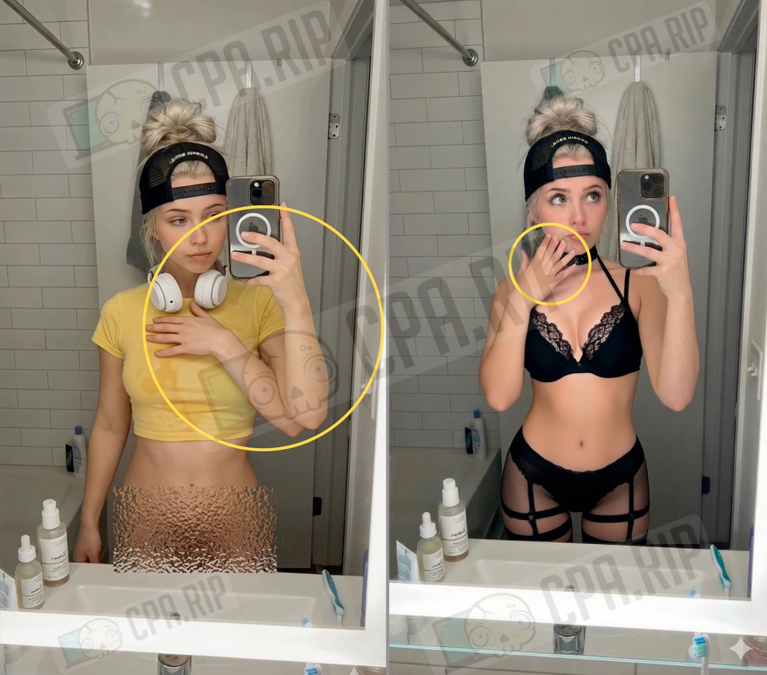 A blonde in black lace lingerie dances sexily, moving her hips in front of a mirror. She slides one bra strap off her shoulder with her hand. A mirror selfie video.