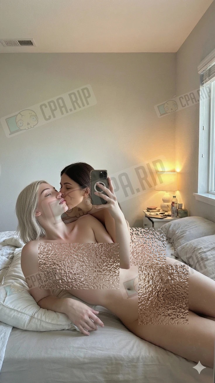 Completely naked. No shirt or underwear. A naked brunette is lying behind her. The girls are kissing.