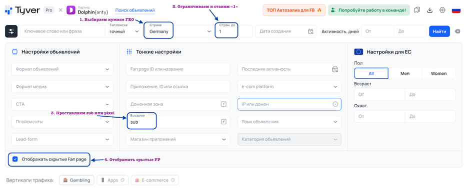 Разберём пример поиска связки через SPY-сервис Tyver и дальнейший залив данных креативов с использованием автозалива Dolphin{cloud}.