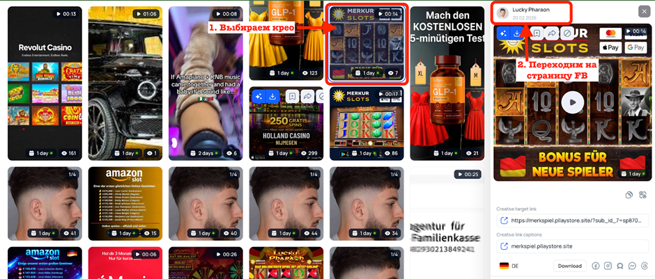 Например: у нас есть креативы под определённый слот или креативы под реальное оффлайн-казино по ГЕО — например, Book of Dead и Merkur Casino под Германию. Схема: Креатив Book of Dead → PWA-дизайн под Book of Dead → Пре-лендинг или лендинг также под этот слот.