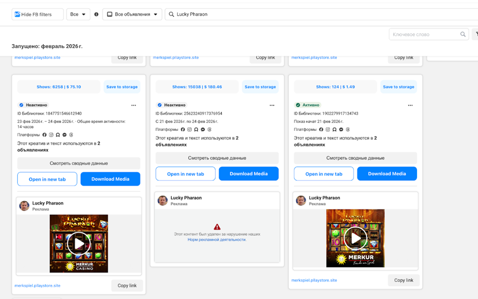 - В библиотеке мы можем посмотреть: что сейчас активно, сколько денег потрачено (если это доступно), когда были запущены объявления и насколько сильно их масштабируют.