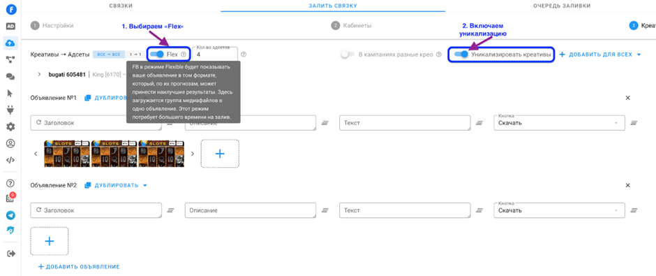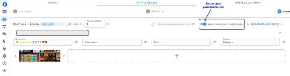 - Шаблон простой: добавили наш аккаунт (как и в антике) → создаём связку (всё как и в FB) → выбираем кабинет, с которого будем запускать → загружаем наши креативы, включаем уникализацию. Очень просто и быстро.
