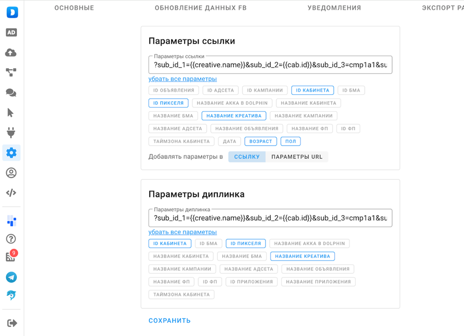 - В поле «В ссылки» можем указать sub, fbpixel или pixel — арбитражники чаще всего передают в этих параметрах свои данные, и таким образом мы оставляем только целевые объявления.