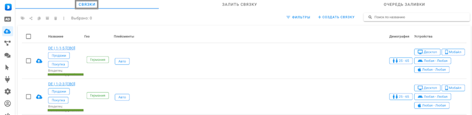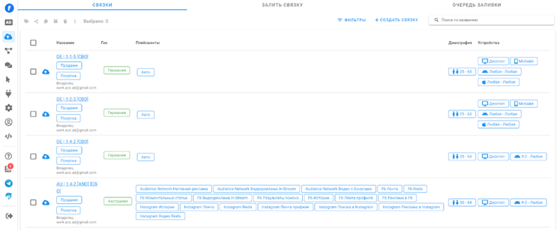 - Рассмотрим на примере сетапа 1-4-2, 1-1-5 в автозаливе Dolphin{cloud} — создание и подготовка «Связки». Всё что нам нужно — это разово создать те связки, с которыми мы работаем, и далее просто сетапить их на все рекламные кампании без постоянной ручной работы. Разово созданные «Связки» мы можем запускать на все наши РК, делиться с командой если вы тим-лид или баер. Полный гайд по созданию связки в Dolphin{cloud} будет в мануале.