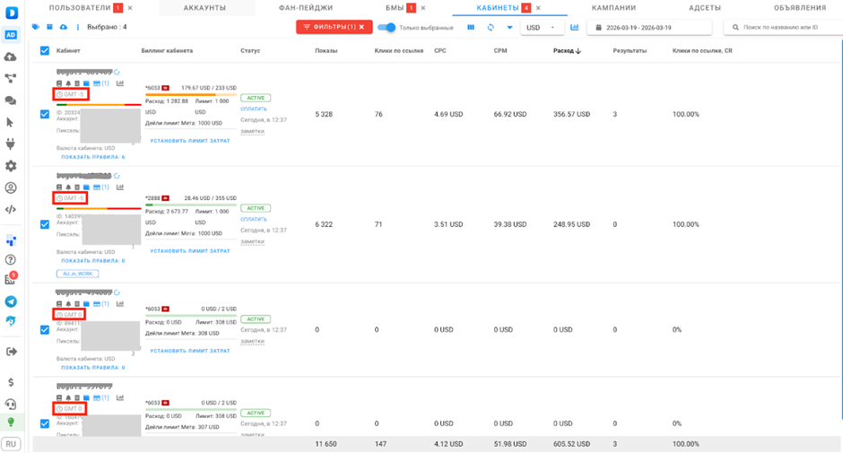 2.Выбираем аккаунты с нужной вам тайм-зоной, которые вы запланировали в тест.