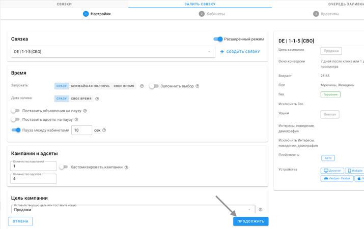 Все эти действия мы можем провести достаточно быстро, используя автозалив — сервис, который помогает баерам сосредоточиться на аналитике, поиске новых связок и работе с трафиком, вместо того чтобы полдня тратить на запуски.