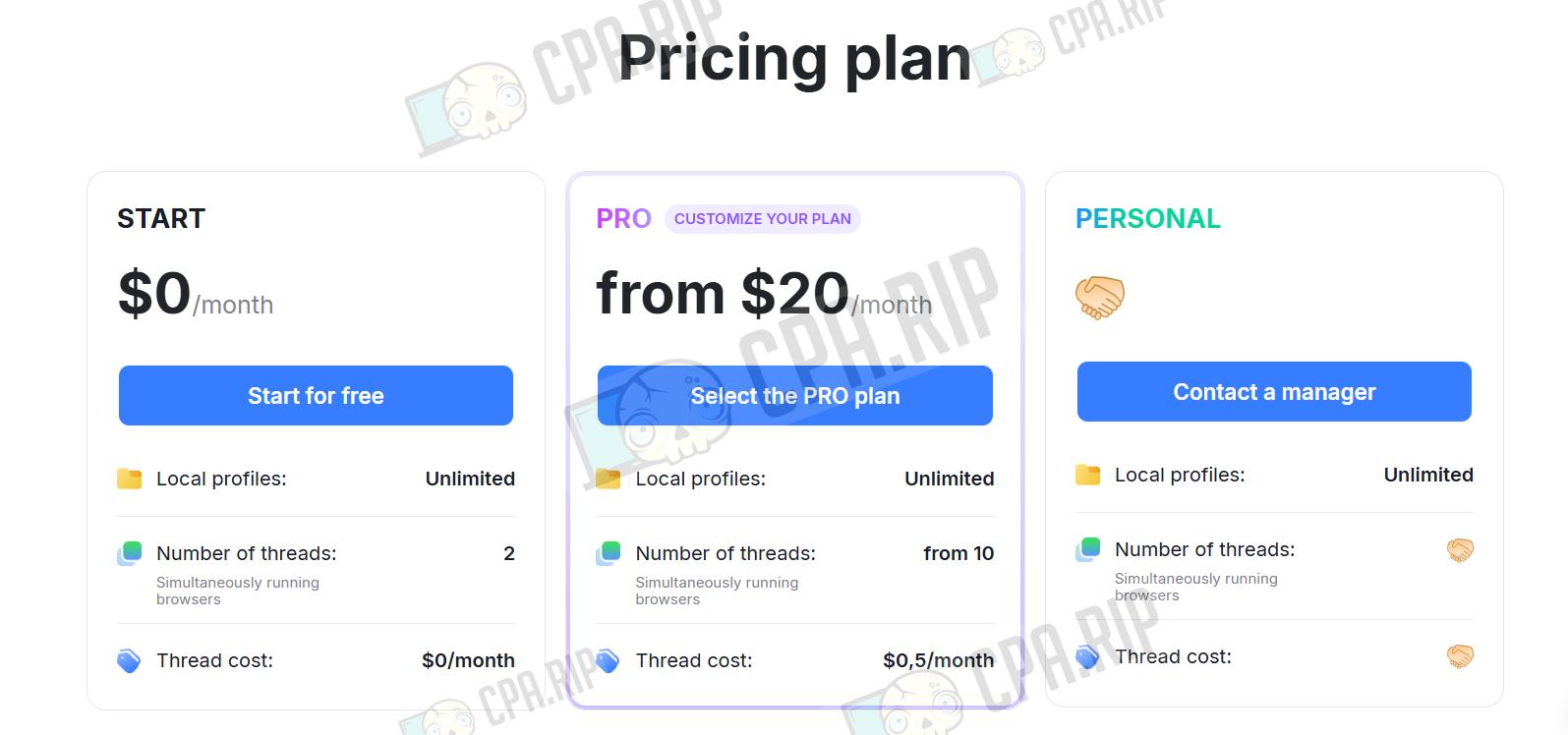 - PRO (customisable plan) — from $20/month: unlimited local profiles, starting from 10 concurrent sessions.