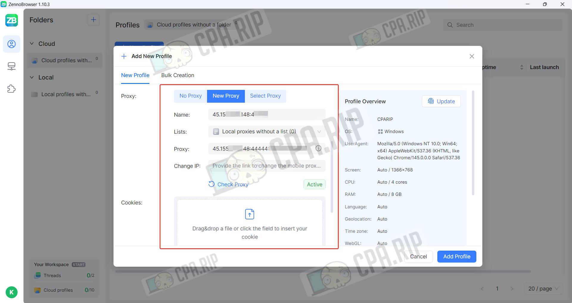 A local profile is stored only on the device where it was created, ensuring maximum launch speed and full control over privacy, but excluding access from other PCs. A cloud profile is stored on the developer’s server, which allows you to synchronise cookies and tabs across different devices and share accounts with colleagues; however, in this case, launch speed depends on the quality of your internet connection.