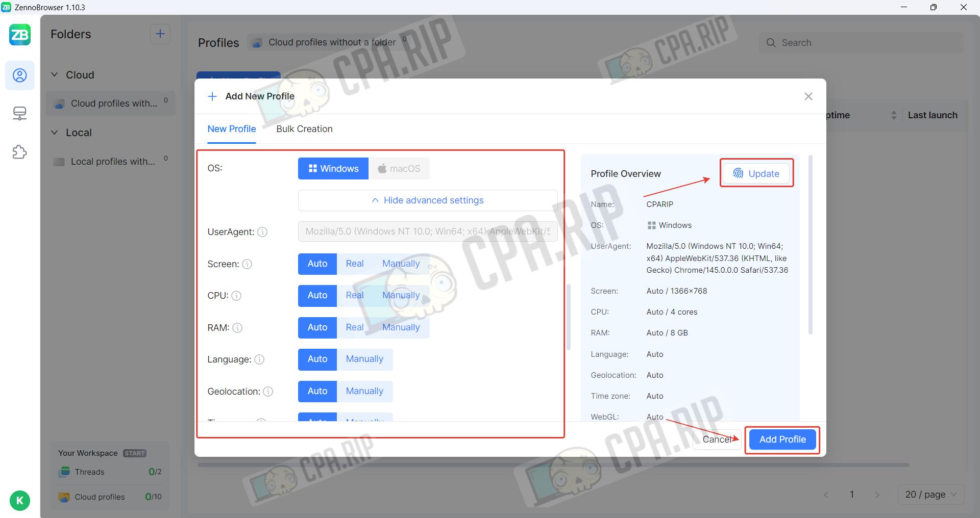 The operating system is Windows only. Advanced settings are also available in the Advanced section. To change the fingerprint, click ‘Update’. Once you have filled in the main settings, click ‘Add profile’.