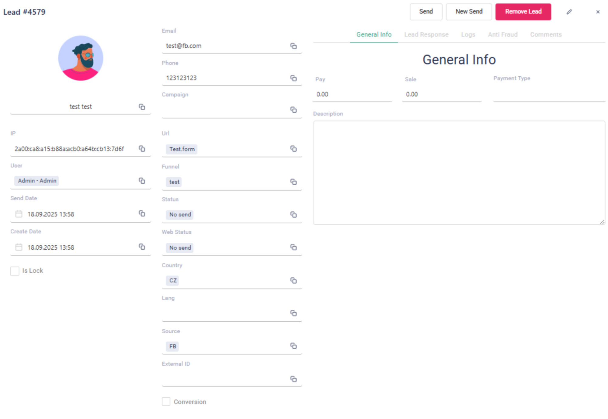 Создаем тестовый лид и проверяем, принят ли он. Для повторного теста лид удаляется и создается заново.