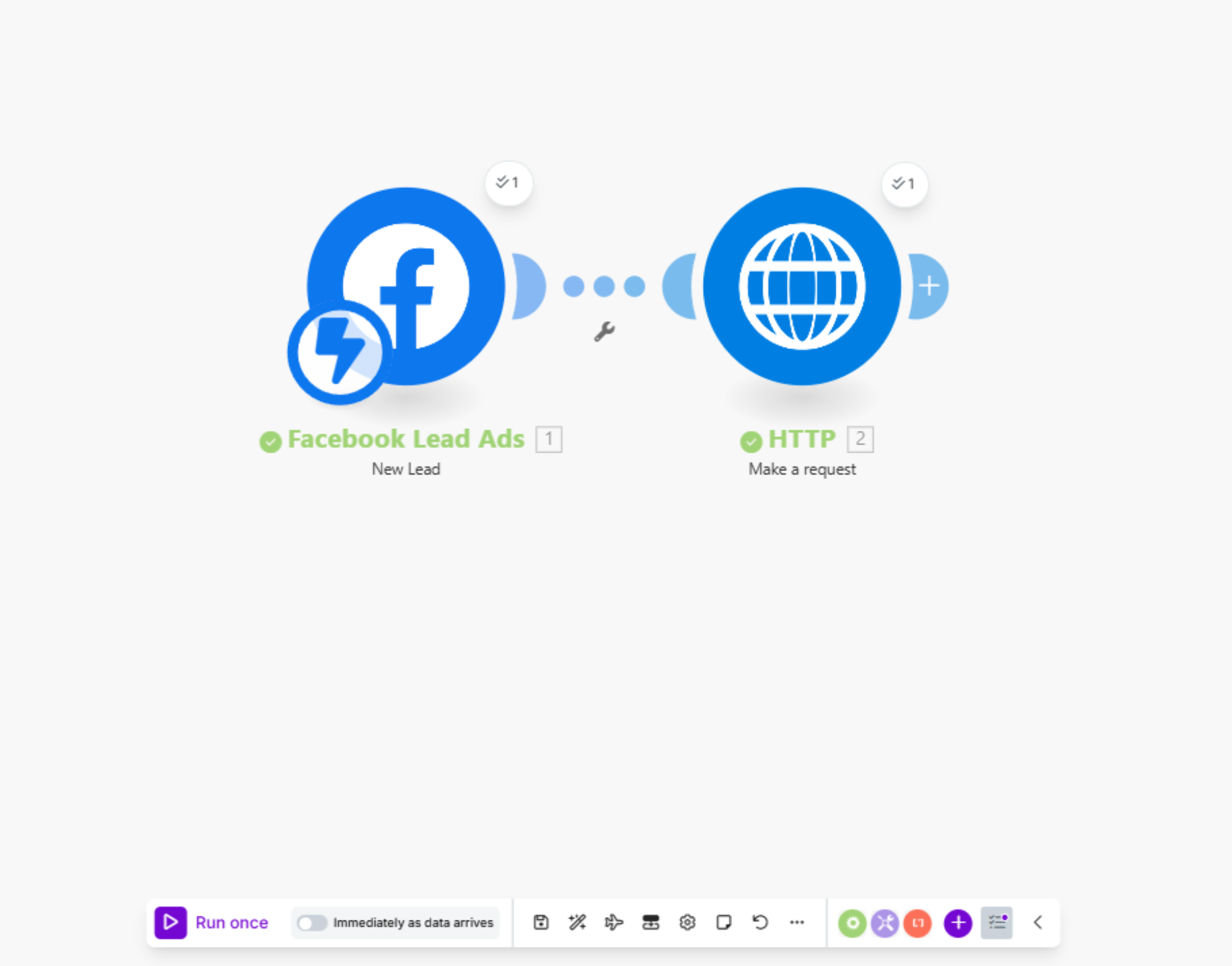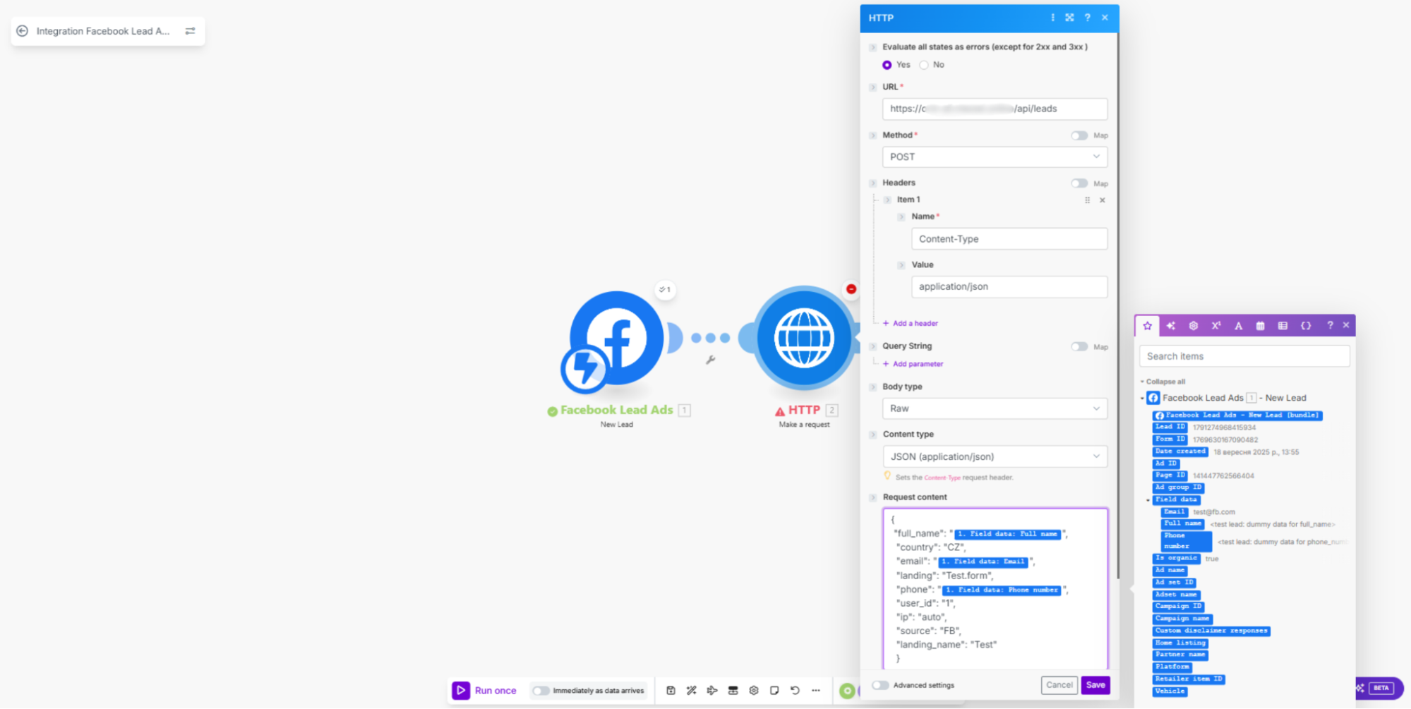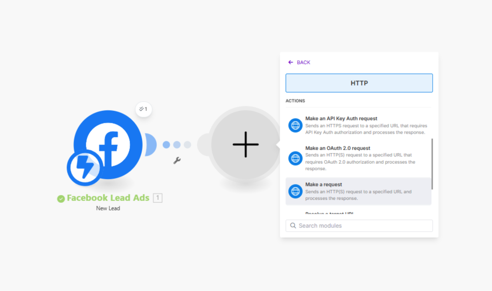 Далее настраивается передача заявок из лид-формы Facebook в CRM. Принцип работы мы покажем на примере CRM Mate, но аналогично можно подключить любую систему или трекер. Для этого добавляем модуль HTTP, затем — «Make a request».
