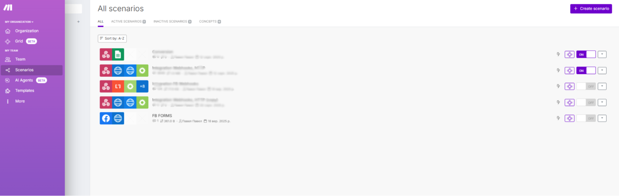 Чтобы связать лид-формы с CRM, можно использовать Make.com. Для начала создаем аккаунт на Make.com. Далее переходим в раздел «Scenarios» и запускаем новый сценарий.
