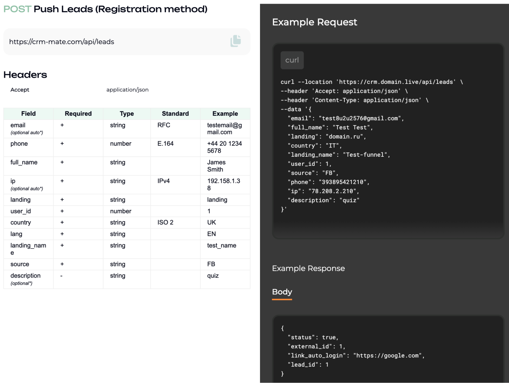 Прописываем URL интеграции и параметры для CRM Mate. Информацию для подключения можно найти во вкладке Doc API. Если используется собственный поддомен, в ссылке его нужно прописать вручную, как указано на скриншоте ниже или вы можете взять готовый запрос у нас на канале.