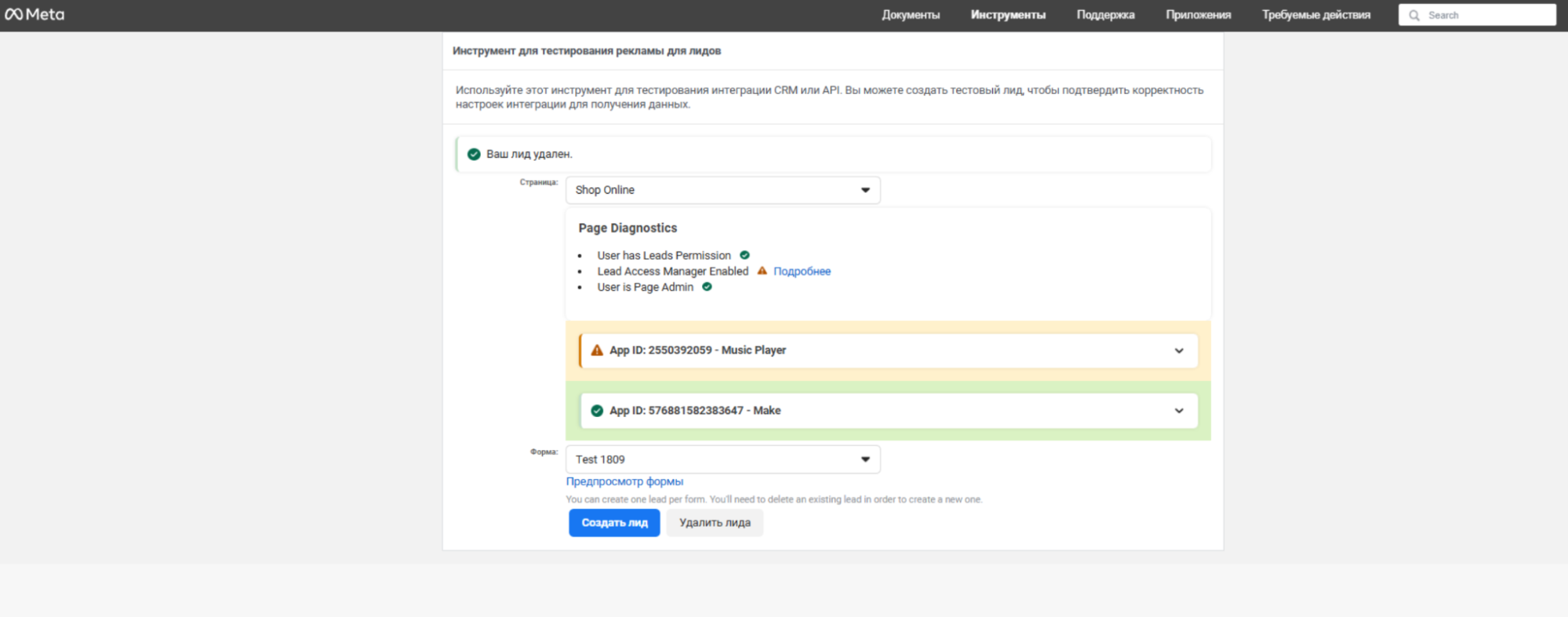 Для финальной проверки в Lead Ads Testing Tool удаляем и снова создаем лид.