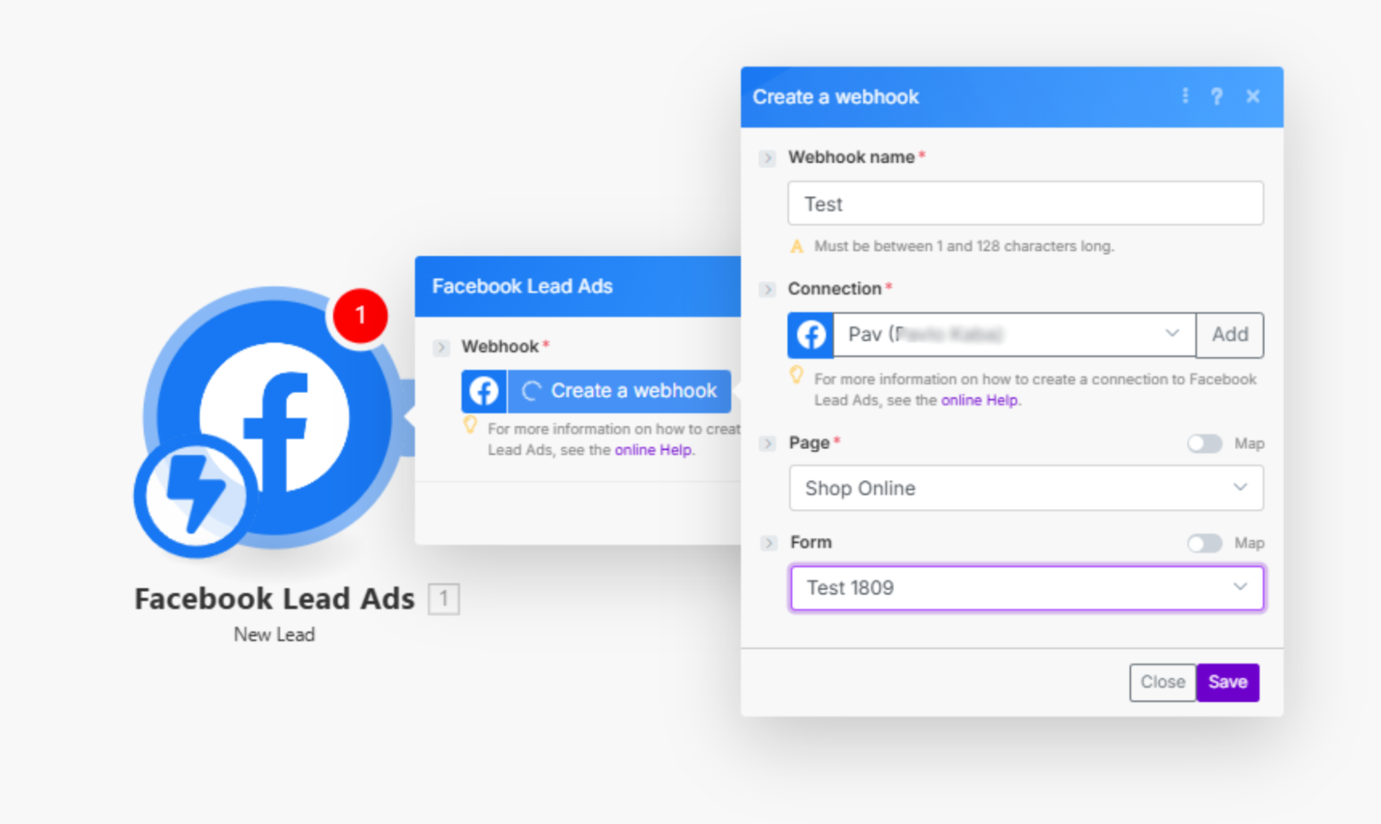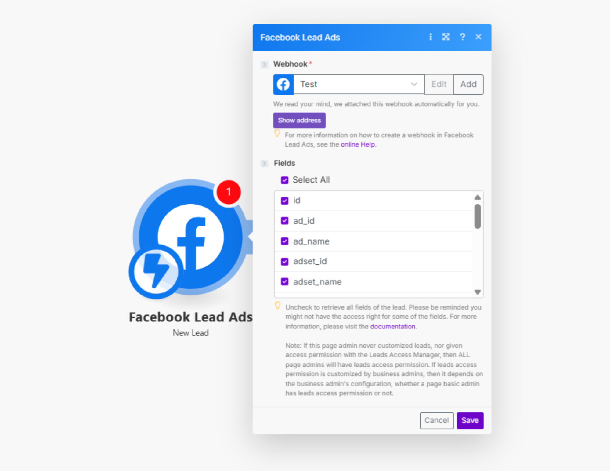 Создаем Webhook и подключаем аккаунт. Указываем бизнес-страницу и форму заявки, сохраняем настройки.