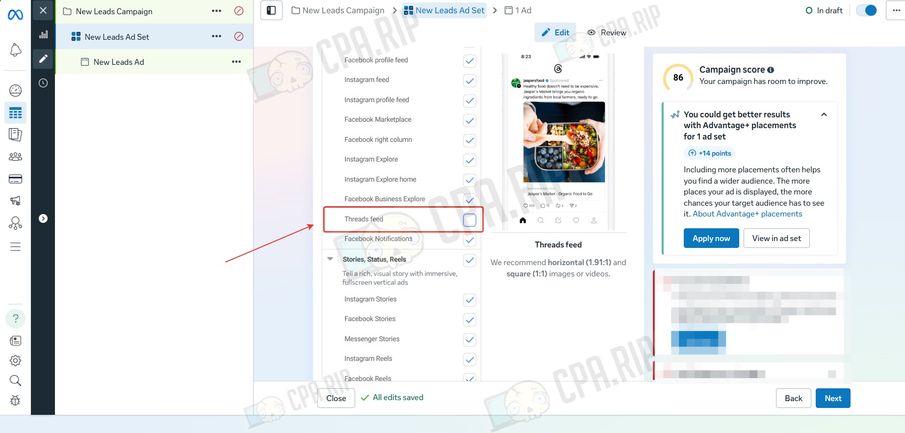 - Чтобы обойти данное ограничение, не привязывая аккаунт Instagram, перед публикацией отключите Placements «Threads feed».