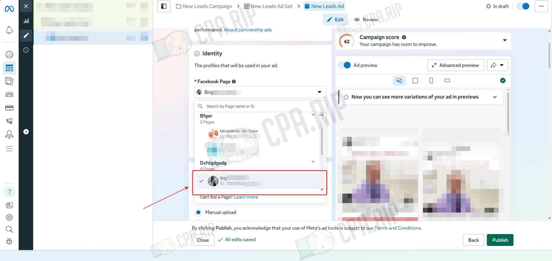 - Далее, если отключение placements не помогло, смените Fan Page: выберите другую существующую или создайте новую.