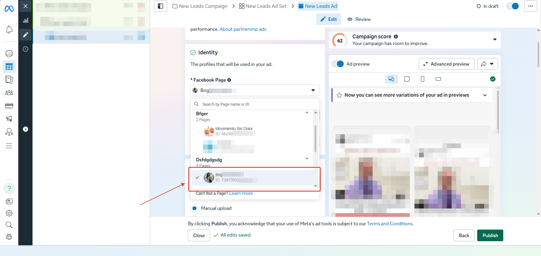 - Далее, если отключение placements не помогло, смените Fan Page: выберите другую существующую или создайте новую.