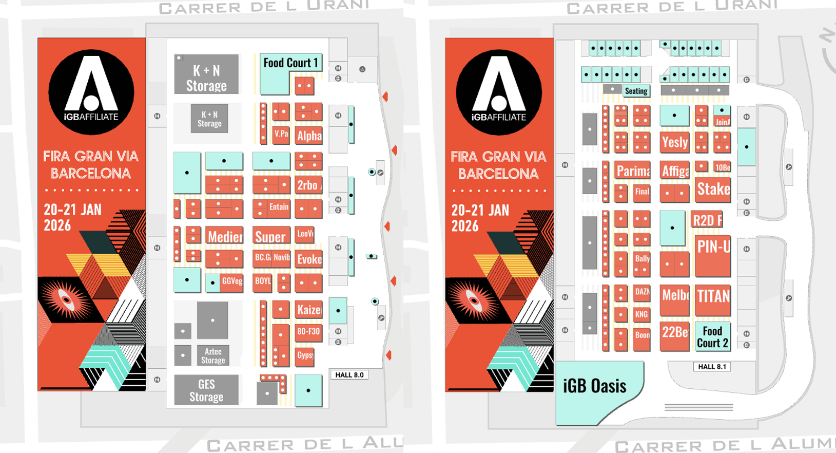 Фотографии всех стендов с конференции iGB Affiliate 2026 в Барселоне 20-21 января, с картой стендов, фото и ссылками.