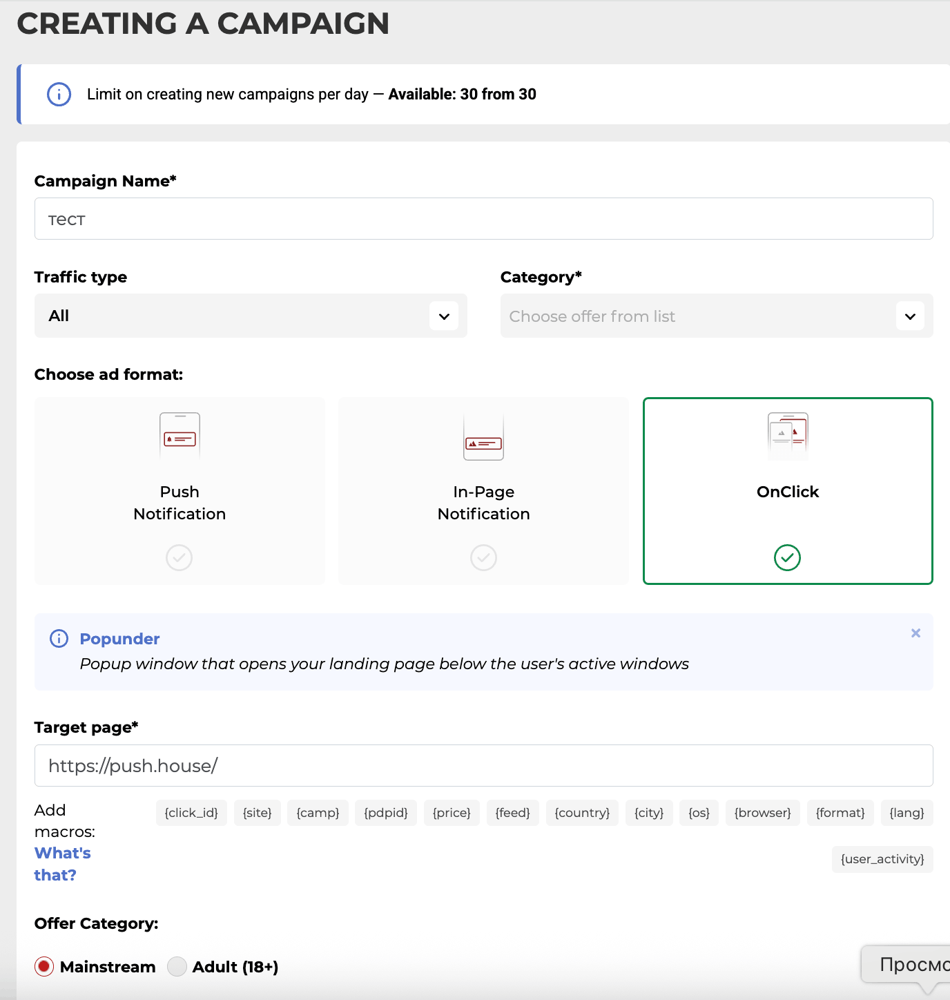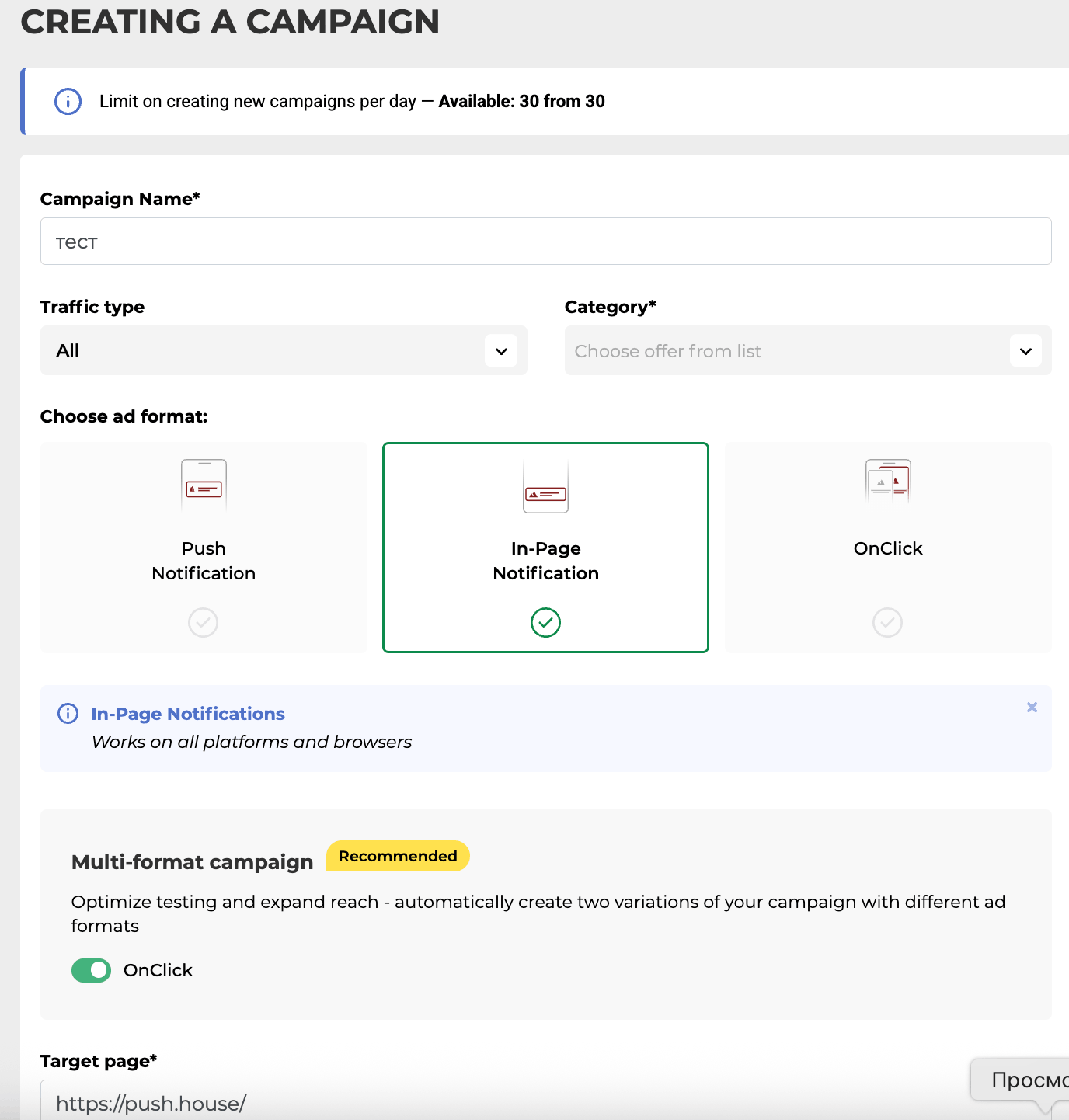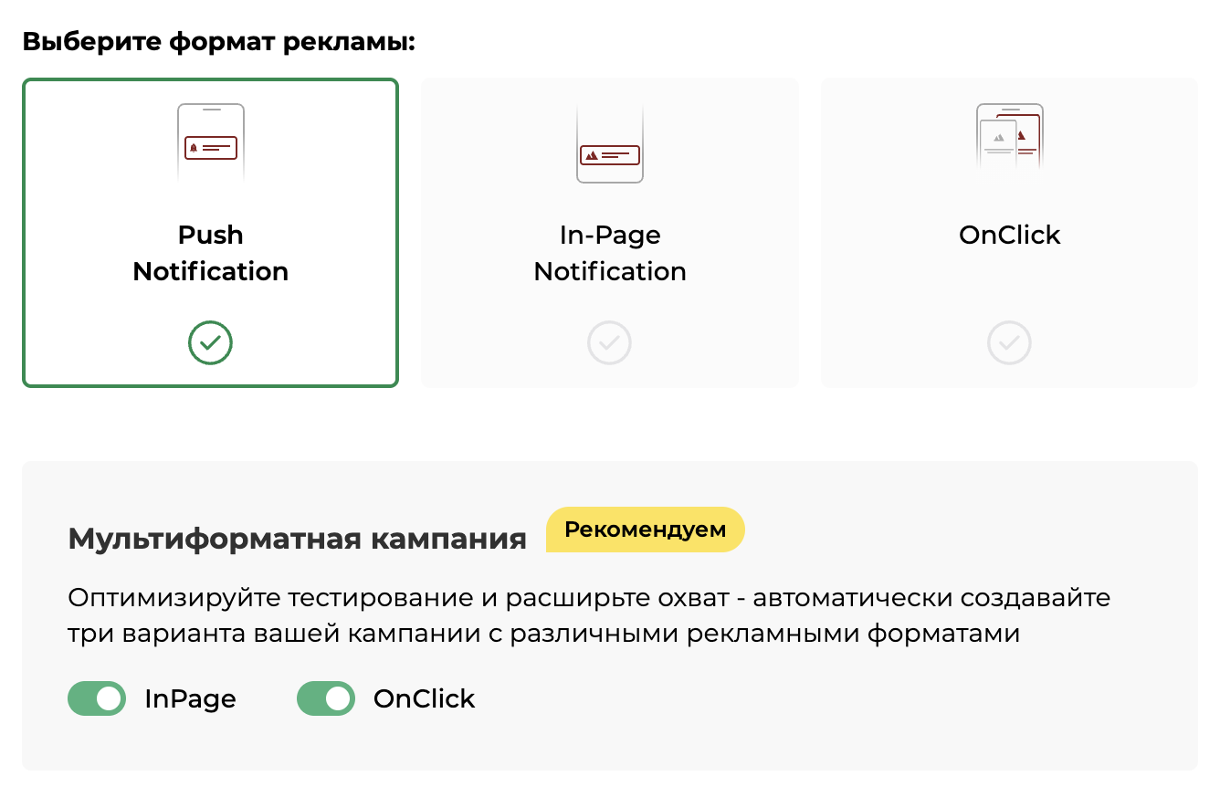 - Мультиформатные кампании Возможность запускать одну кампанию одновременно в трёх форматах: Push, In-Page, OnClick. Настройки (креативы, лендинги, ставки и т.д.) копируются автоматически между форматами.