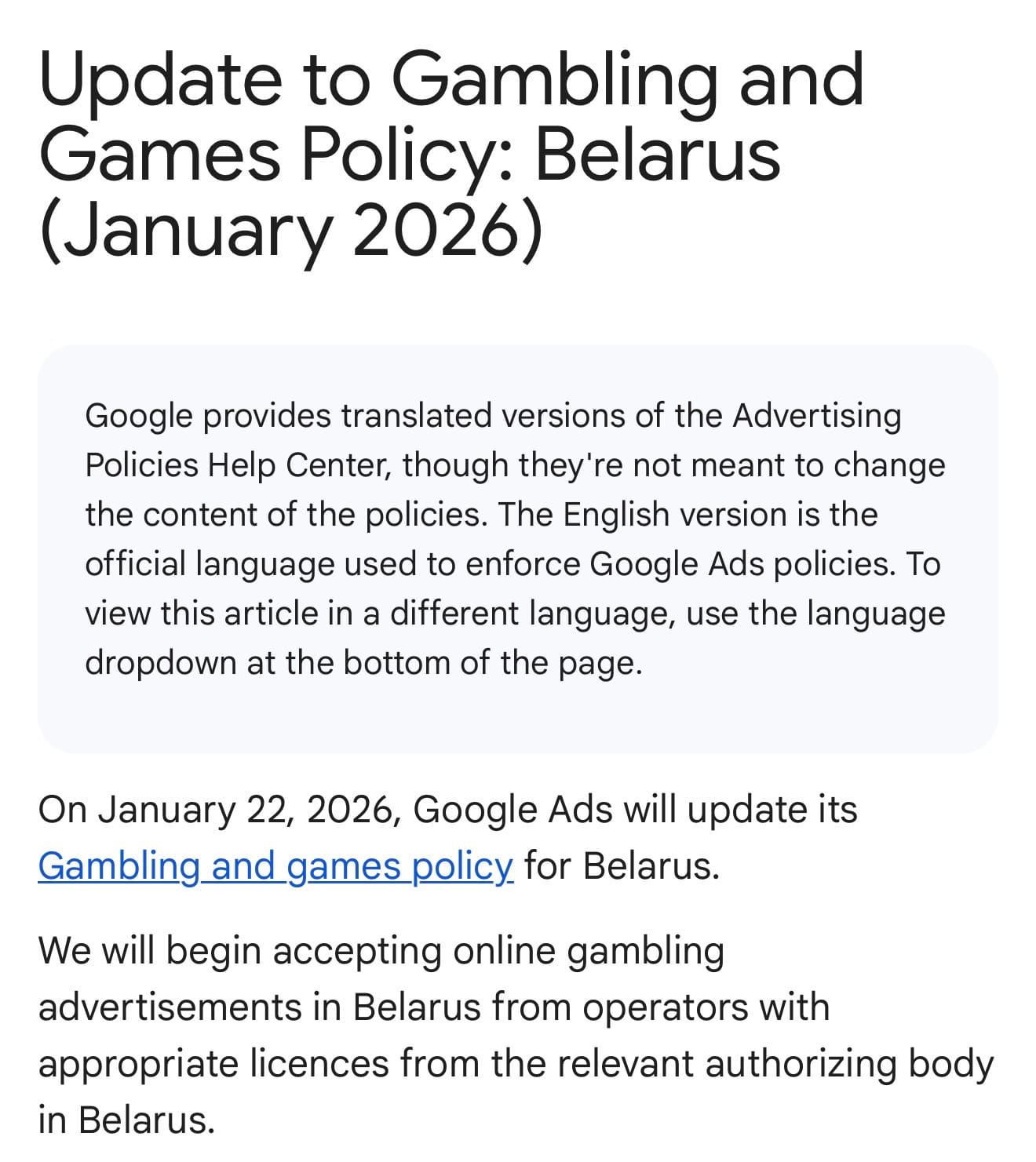 Компания Google с 22 января 2026 года разрешит операторам онлайн-азартных с белорусской лицензией рекламироваться в Google Ads в Беларуси. Об этом компания сообщила 6 января, обновив свою политику.