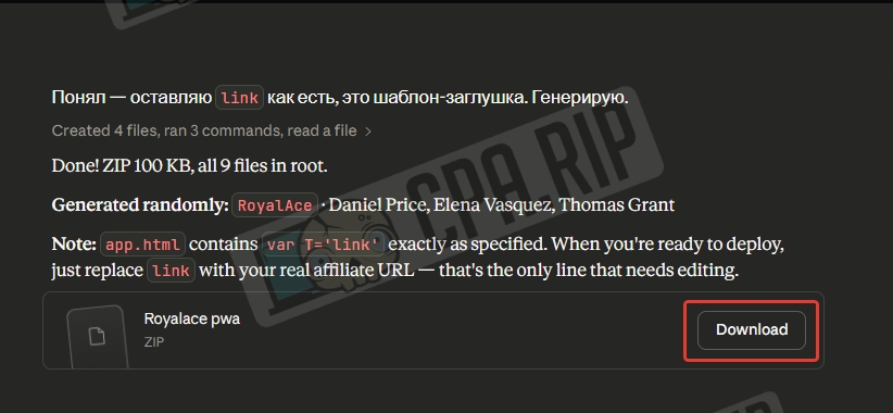 Задайте в промпте свои параметры, такие как: название приложения, короткое название, разработчик, категория, язык, партнерская ссылка, рейтинг, количество отзывов, количество скачиваний, размер приложения, возрастное ограничение, время показа сплэш-скрина, количество скриншотов. Так же можно задать свои описания, отзывы и скриншоты, либо оставить данные параметры генерировать случайным образом. Все, что находится ниже этих параметров, оставьте без изменений.