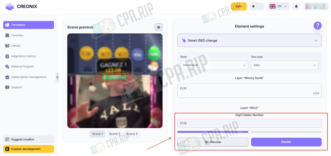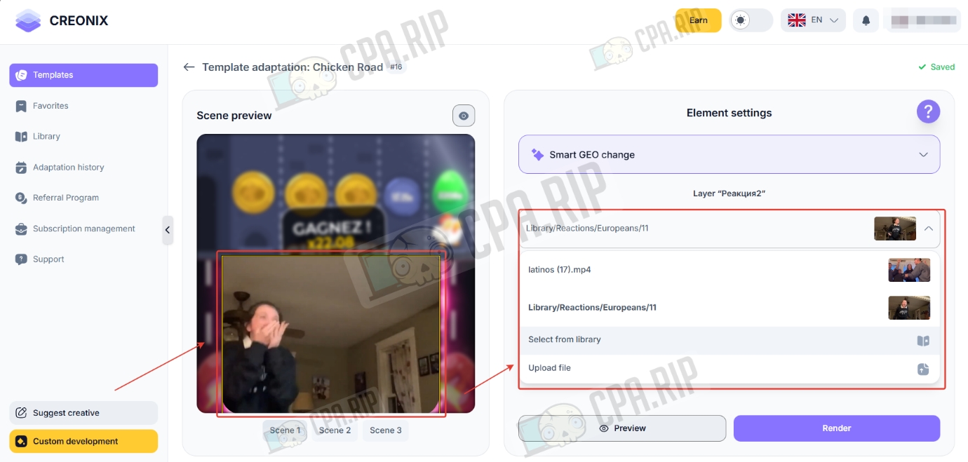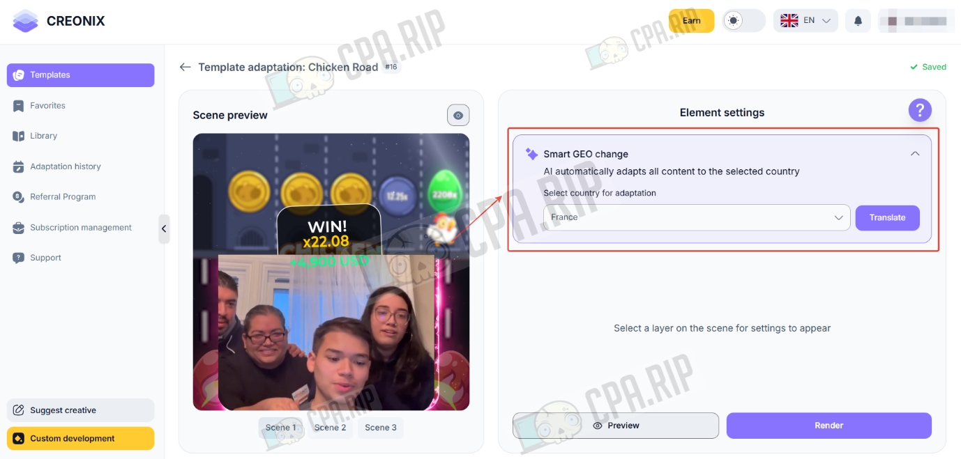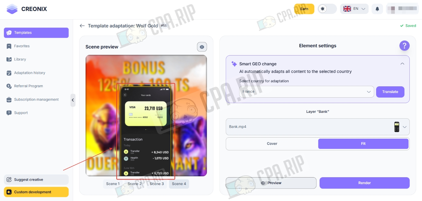 Creonix — AI-инструмент для быстрой сборки видео-креативов в gambling-вертикали. Сервис работает как облачный конструктор, который дает возможность за считанные минуты адаптировать готовые шаблоны под разные страны: система автоматически меняет языки, валюты и визуальные триггеры, такие как пуш-уведомления от локальных банков или интерфейсы популярных слотов.