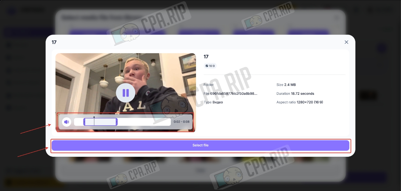 - Выберите нужный момент видео и нажмите «Select file».