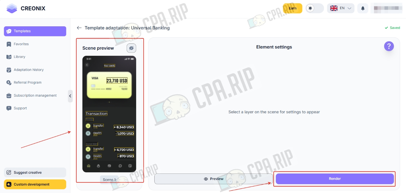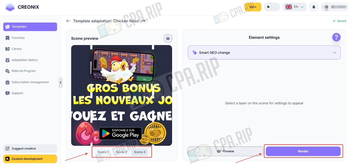 - Настройте каждую сцена креатива и нажмите «Render».