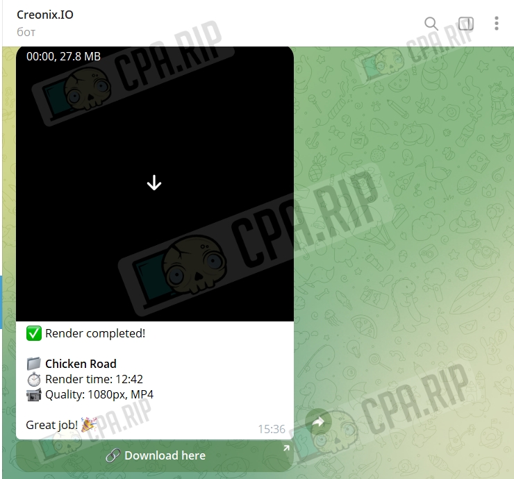 - Синхронизирует процесс с Telegram-ботом, который мгновенно присылает уведомление и прямую ссылку на скачивание готового файла.