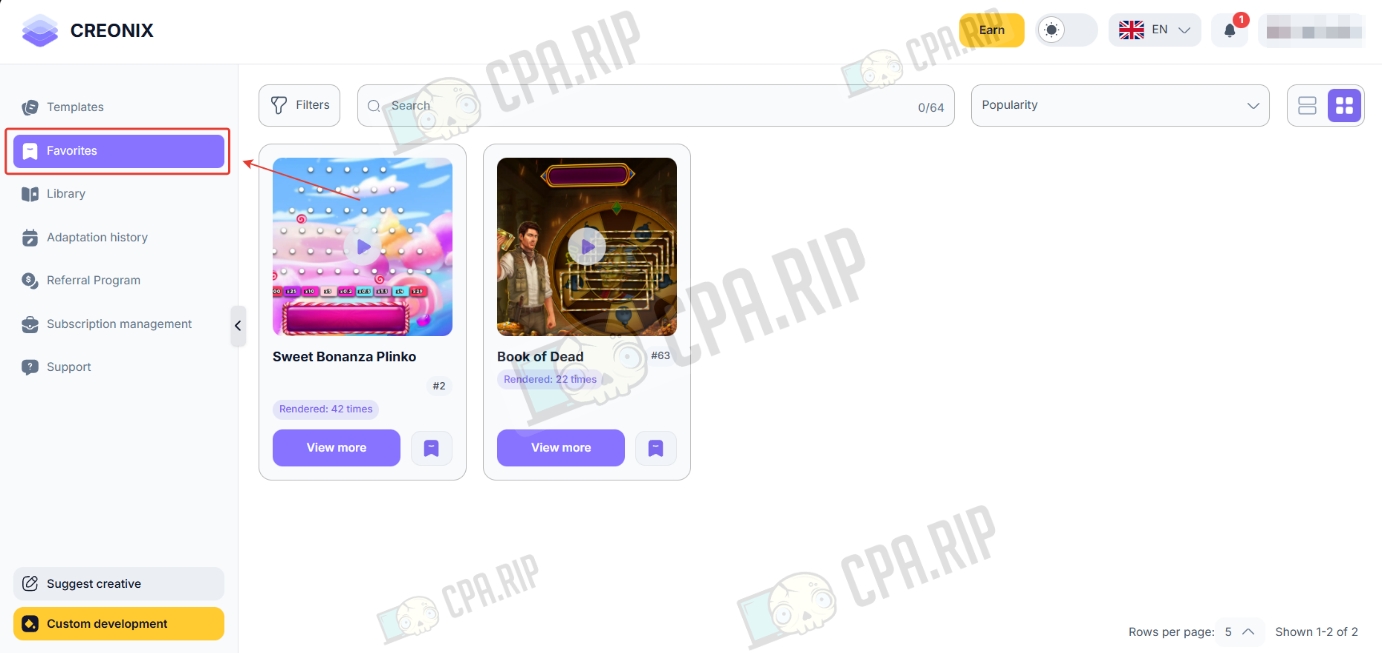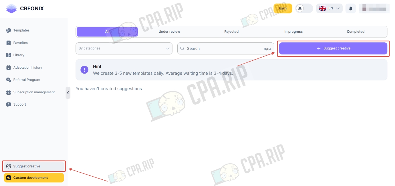 В разделе «Suggest creative» можно оставить заявку на разработку нового шаблона. После создания вы получите:
