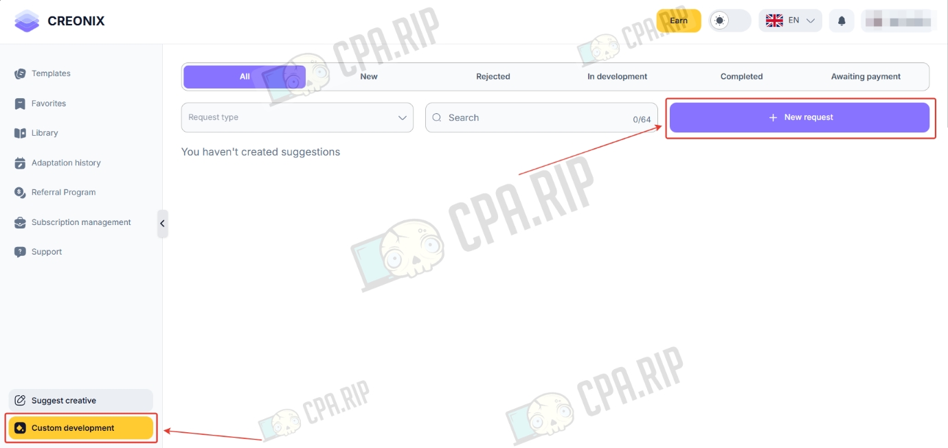 В разделе «Custom development» можно запросить индивидуальную разработку. дизайна креатива.